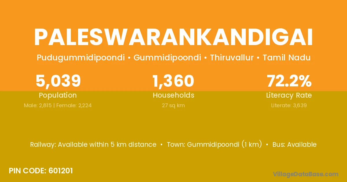 Gummidipoondi (1 km) is the nearest town to Paleswarankandigai village for major economic activities and is located approximately 1 km away.