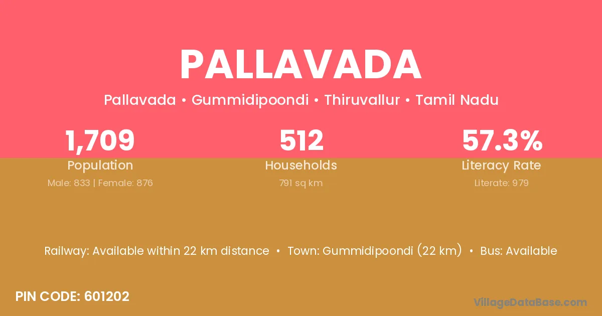 Gummidipoondi (22 km) is the nearest town to Pallavada village for major economic activities and is located approximately 22 km away.