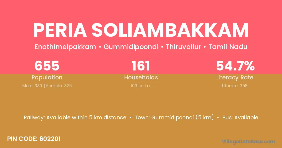 Gummidipoondi (5 km) is the nearest town to Peria Soliambakkam village for major economic activities and is located approximately 5 km away.