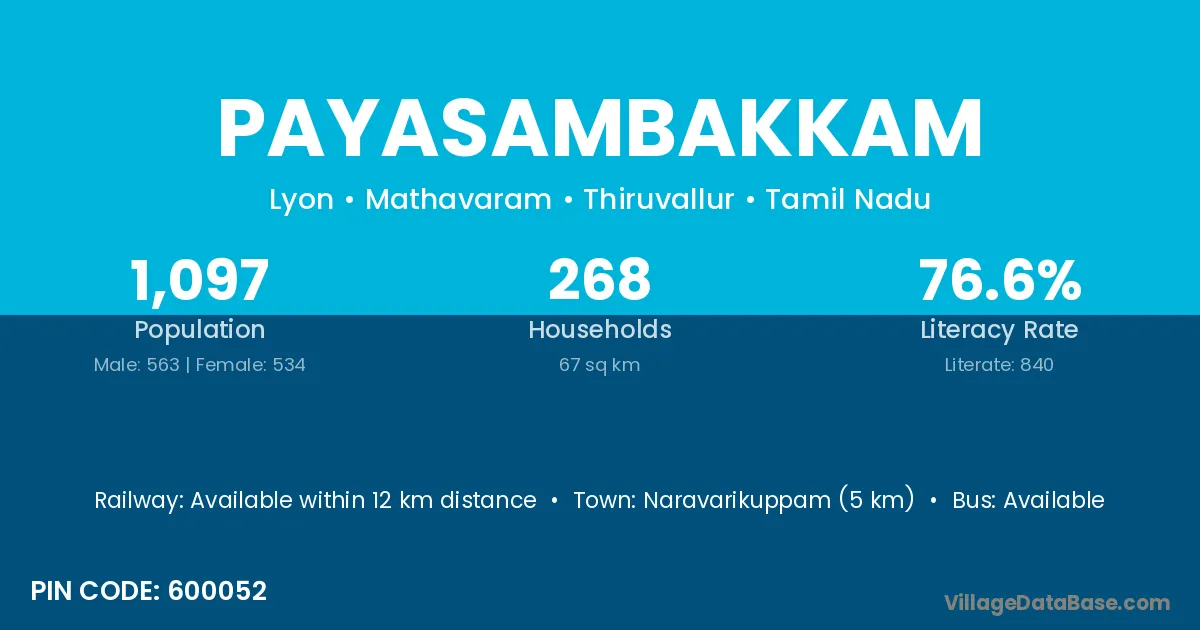 Payasambakkam village has a total population of 1,097 people, of which 563 are males and 534 are females.