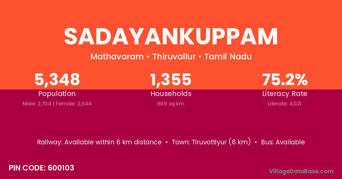 Tiruvottiyur (6 km) is the nearest town to Sadayankuppam village for major economic activities and is located approximately 6 km away.