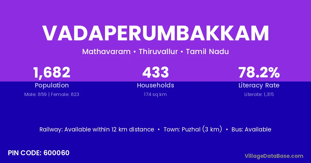Puzhal (3 km) is the nearest town to Vadaperumbakkam village for major economic activities and is located approximately 3 km away.