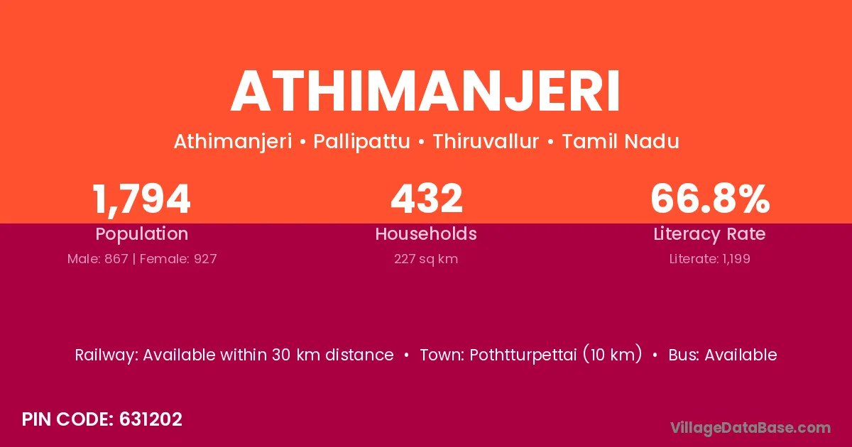 Pothtturpettai (10 km) is the nearest town to Athimanjeri village for major economic activities and is located approximately 10 km away.
