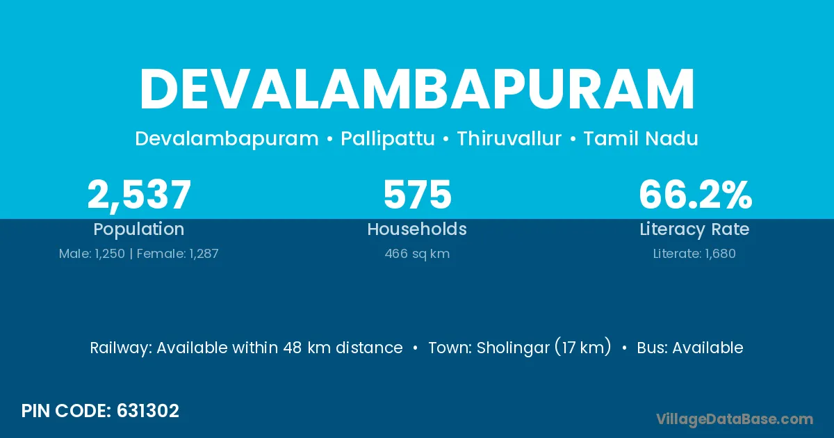 Sholingar (17 km) is the nearest town to Devalambapuram village for major economic activities and is located approximately 17 km away.