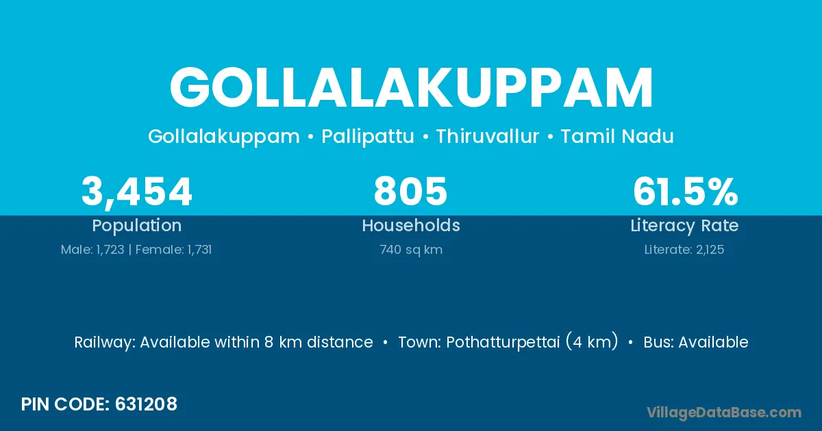 Gollalakuppam village has a total population of 3,454 people, of which 1,723 are males and 1,731 are females.