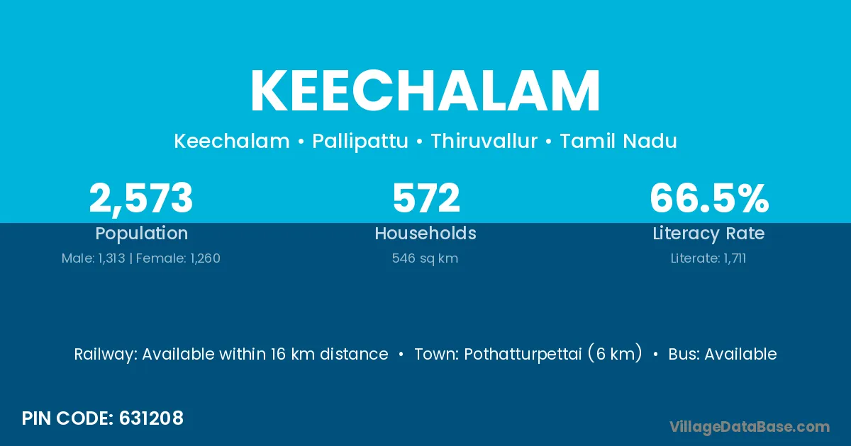Pothatturpettai (6 km) is the nearest town to Keechalam village for major economic activities and is located approximately 6 km away.