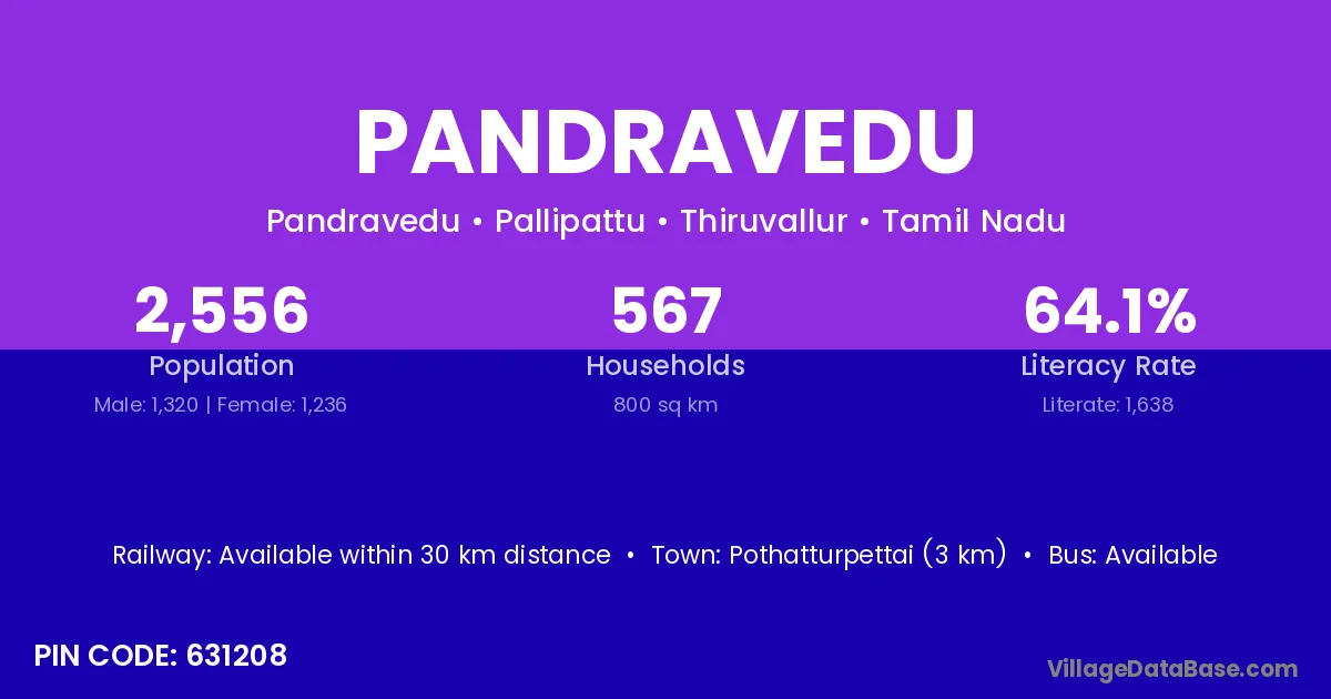 Pothatturpettai (3 km) is the nearest town to Pandravedu village for major economic activities and is located approximately 3 km away.