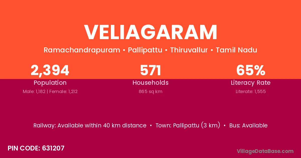 Pallipattu (3 km) is the nearest town to Veliagaram village for major economic activities and is located approximately 3 km away.