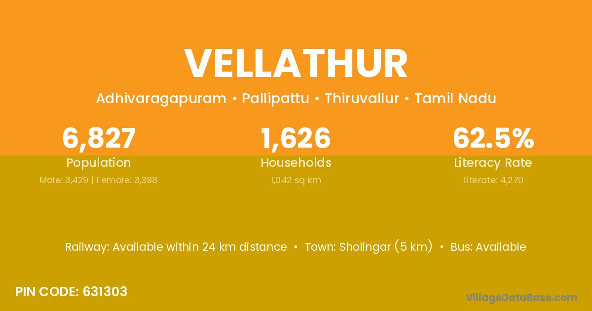 Sholingar (5 km) is the nearest town to Vellathur village for major economic activities and is located approximately 5 km away.
