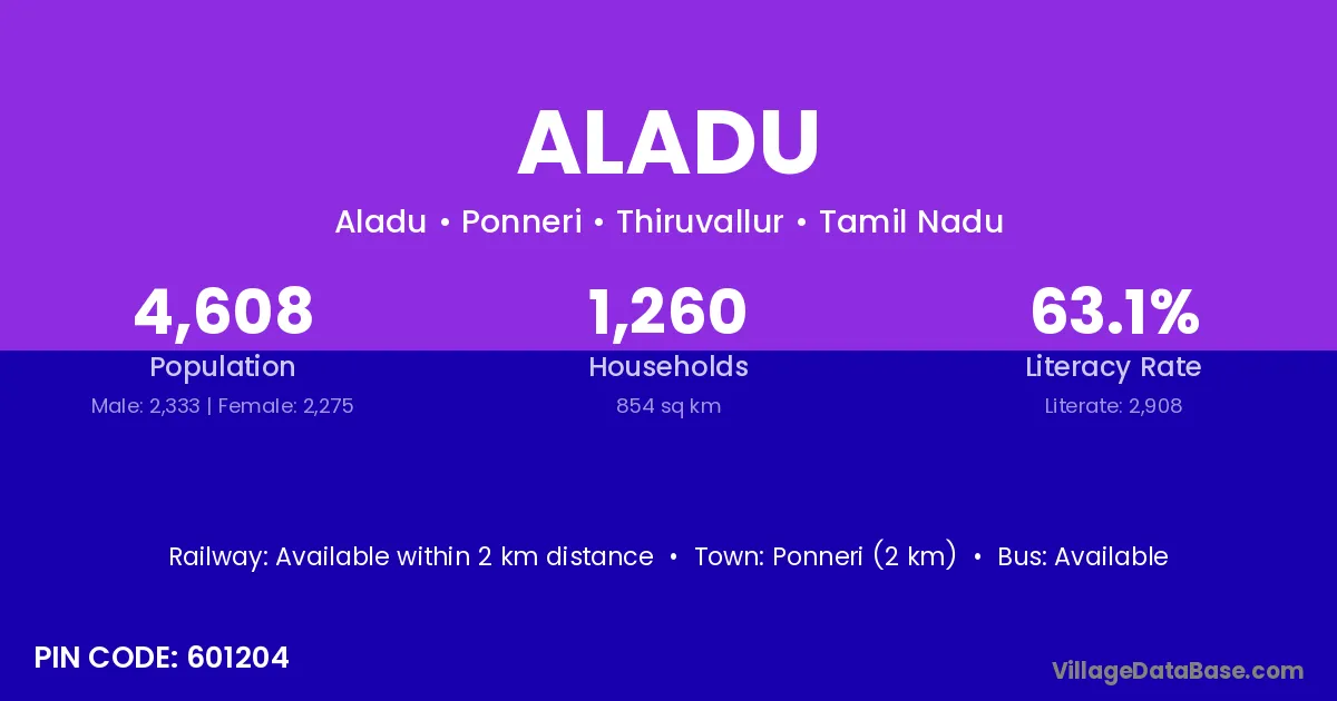Ponneri (2 km) is the nearest town to Aladu village for major economic activities and is located approximately 2 km away.