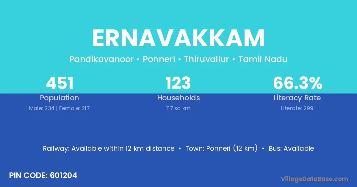 Ernavakkam village has a total population of 451 people, of which 234 are males and 217 are females.