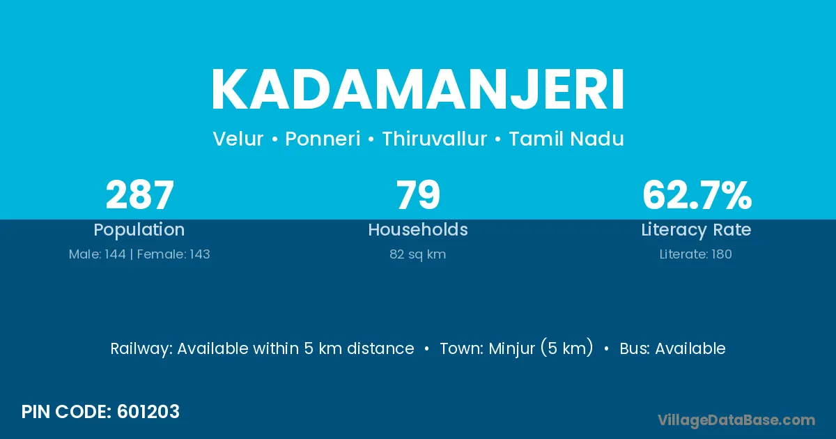 Minjur (5 km) is the nearest town to Kadamanjeri village for major economic activities and is located approximately 5 km away.