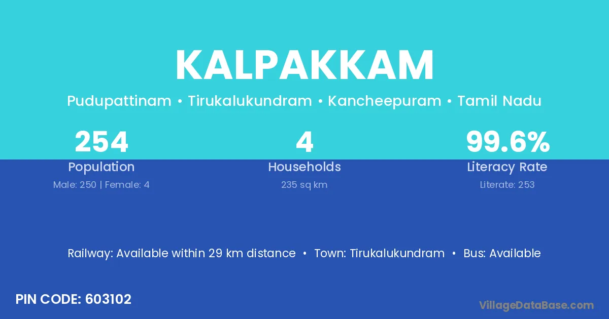 Minjur (4 km) is the nearest town to Kalpakkam village for major economic activities and is located approximately 4 km away.