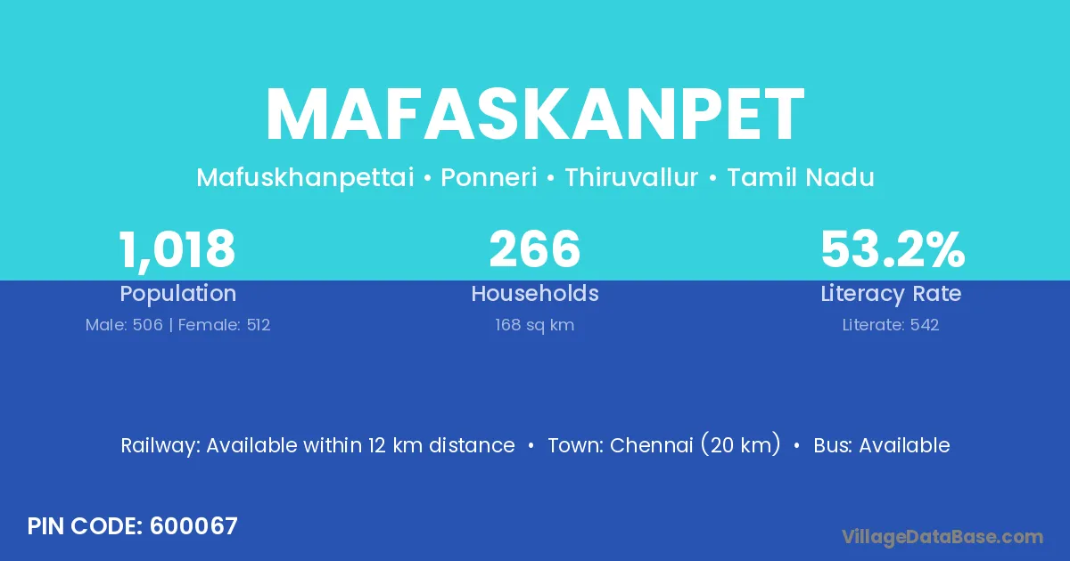 Chennai (20 km) is the nearest town to Mafaskanpet village for major economic activities and is located approximately 20 km away.