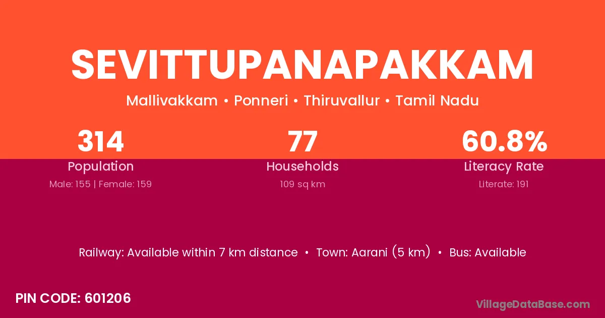 Aarani (5 km) is the nearest town to Sevittupanapakkam village for major economic activities and is located approximately 5 km away.