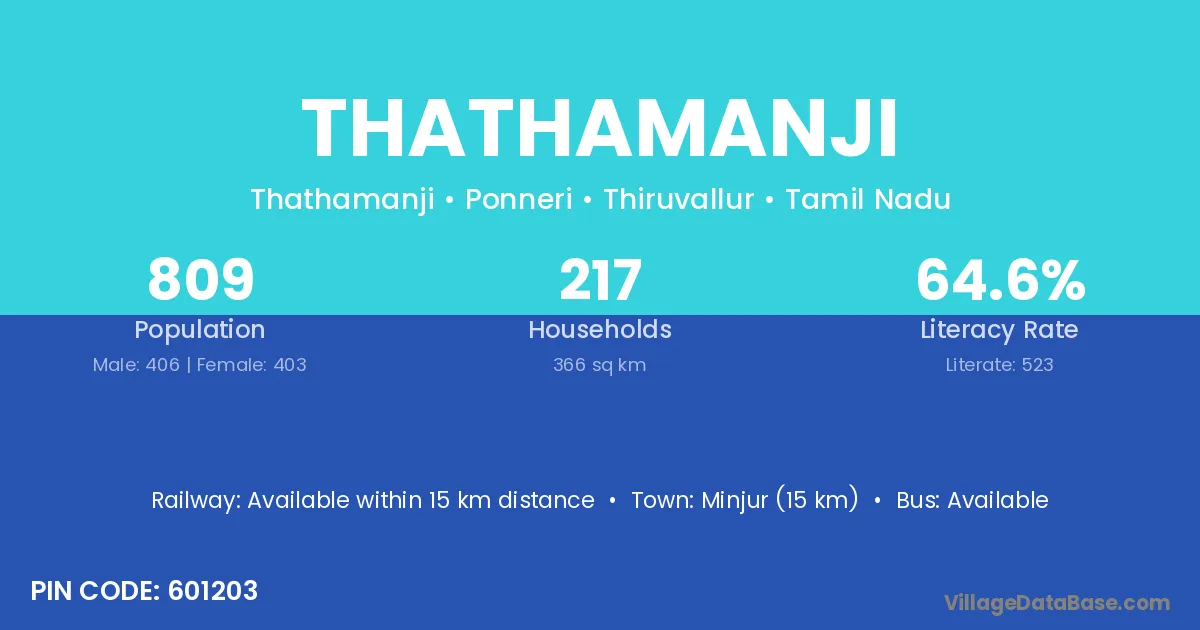 Minjur (15 km) is the nearest town to Thathamanji village for major economic activities and is located approximately 15 km away.