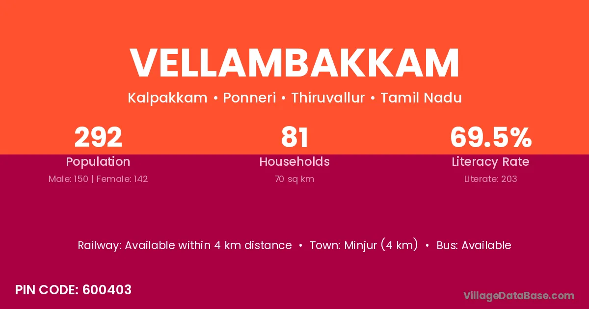 Minjur (4 km) is the nearest town to Vellambakkam village for major economic activities and is located approximately 4 km away.