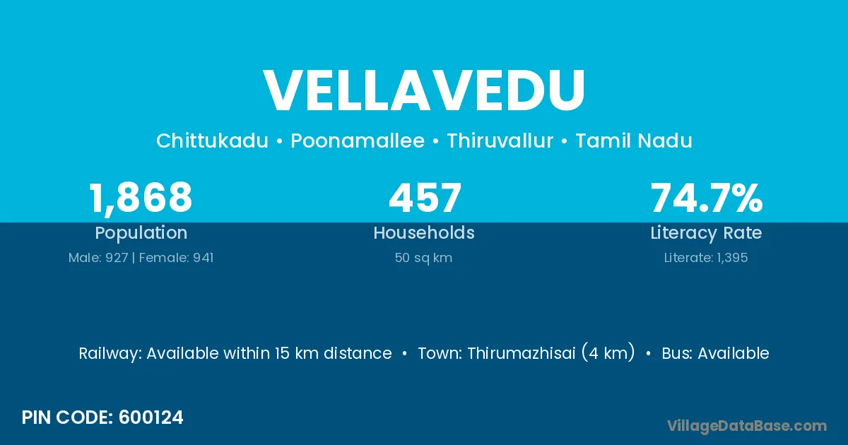 Thirumazhisai (4 km) is the nearest town to Vellavedu village for major economic activities and is located approximately 4 km away.