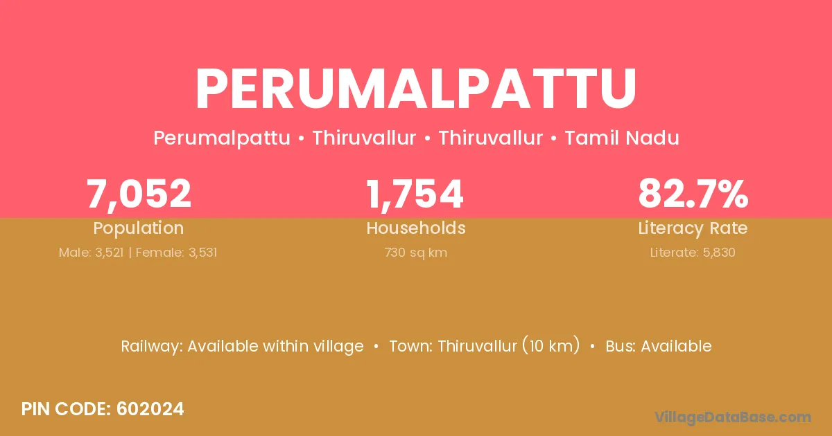Perumalpattu village has a total population of 7,052 people, of which 3,521 are males and 3,531 are females.