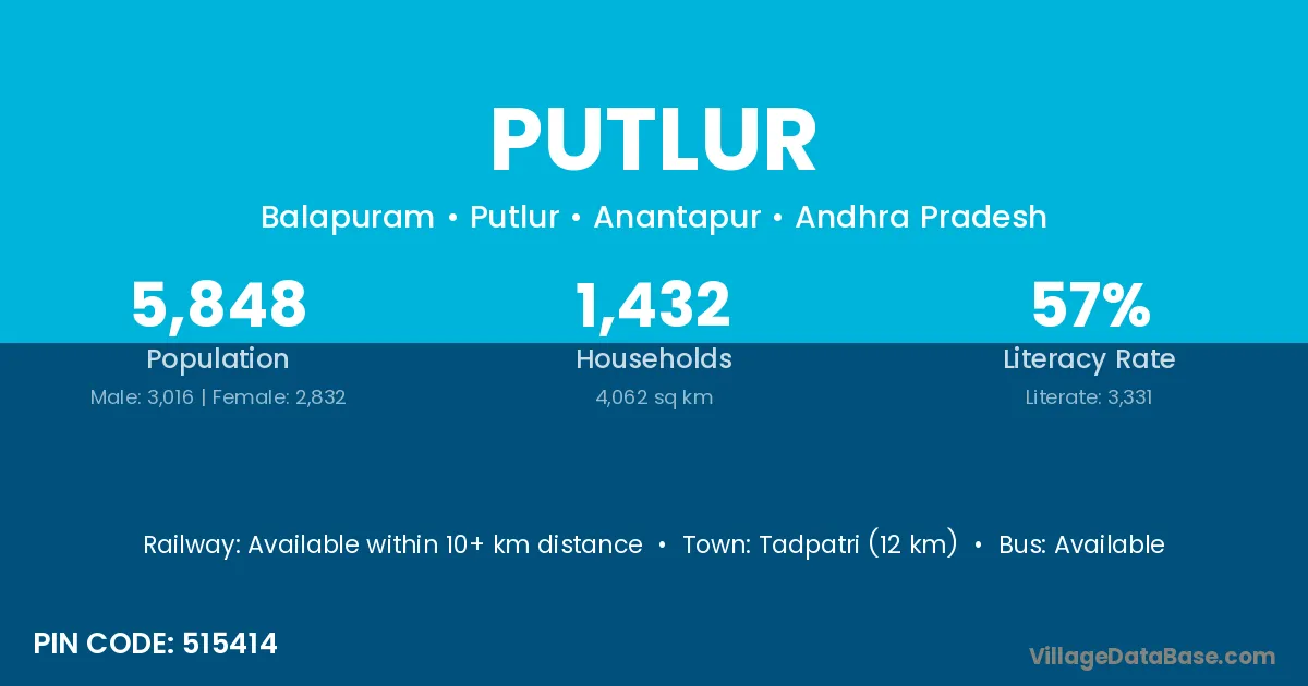Putlur village has a total population of 6,047 people, of which 3,088 are males and 2,959 are females.