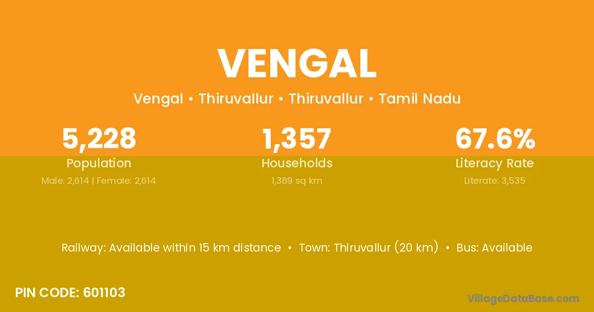 Thiruvallur (20 km) is the nearest town to Vengal village for major economic activities and is located approximately 20 km away.