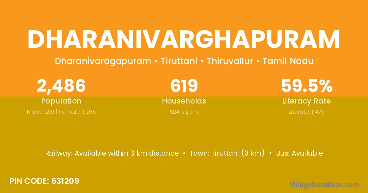 Dharanivarghapuram village has a total population of 2,486 people, of which 1,231 are males and 1,255 are females.