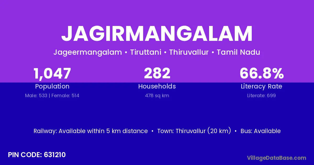Thiruvallur (20 km) is the nearest town to Jagirmangalam village for major economic activities and is located approximately 20 km away.