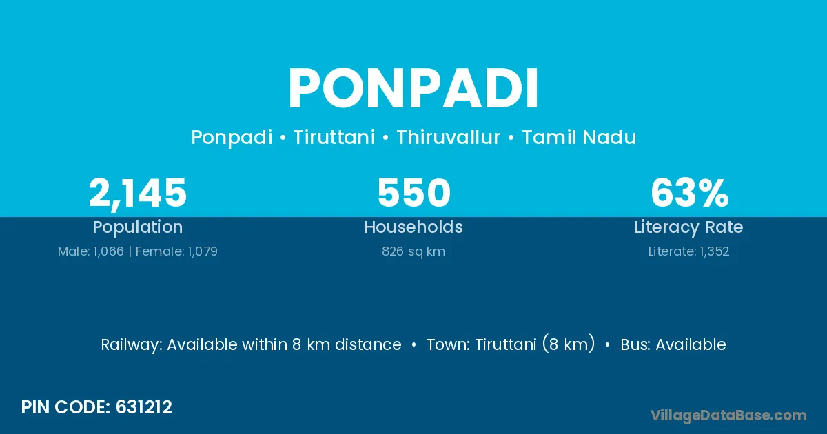 Tiruttani (8 km) is the nearest town to Ponpadi village for major economic activities and is located approximately 8 km away.