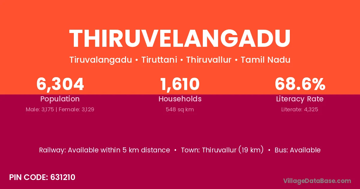 Thiruvelangadu village has a total population of 6,304 people, of which 3,175 are males and 3,129 are females.