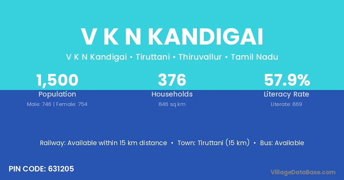 V K N Kandigai village has a total population of 1,500 people, of which 746 are males and 754 are females.