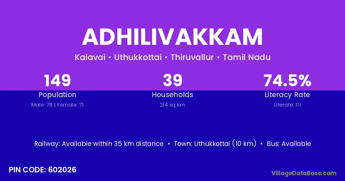 Adhilivakkam village has a total population of 149 people, of which 78 are males and 71 are females.