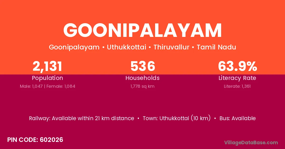 Uthukkottai (10 km) is the nearest town to Goonipalayam village for major economic activities and is located approximately 10 km away.