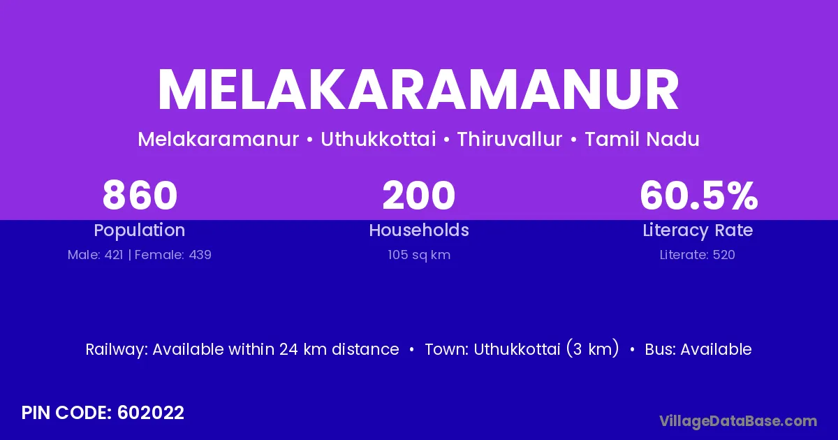 Uthukkottai (3 km) is the nearest town to Melakaramanur village for major economic activities and is located approximately 3 km away.