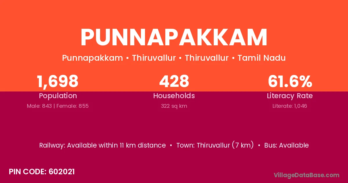 Thirunindravur (14 km) is the nearest town to Punnapakkam village for major economic activities and is located approximately 14 km away.