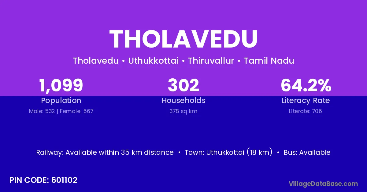 Uthukkottai (18 km) is the nearest town to Tholavedu village for major economic activities and is located approximately 18 km away.