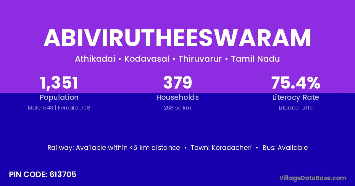 Abivirutheeswaram village has a total population of 1,351 people, of which 643 are males and 708 are females.