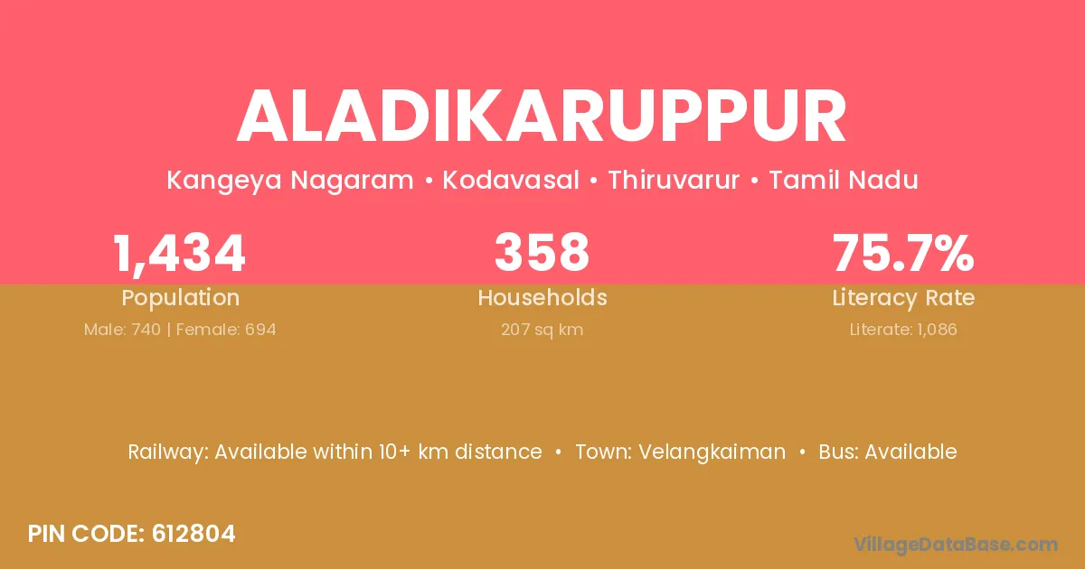 Aladikaruppur village has a total population of 1,434 people, of which 740 are males and 694 are females.