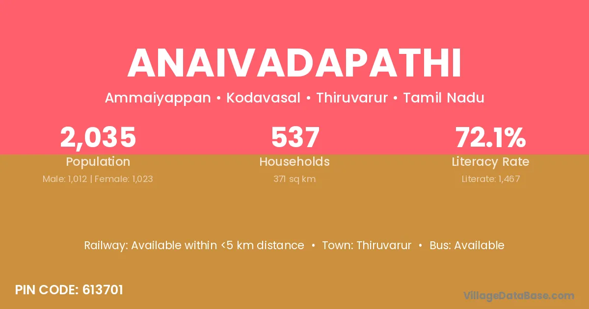 Anaivadapathi village has a total population of 2,035 people, of which 1,012 are males and 1,023 are females.