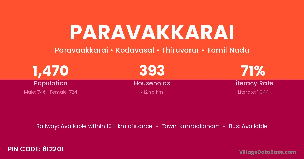 Paravakkarai village has a total population of 1,470 people, of which 746 are males and 724 are females.