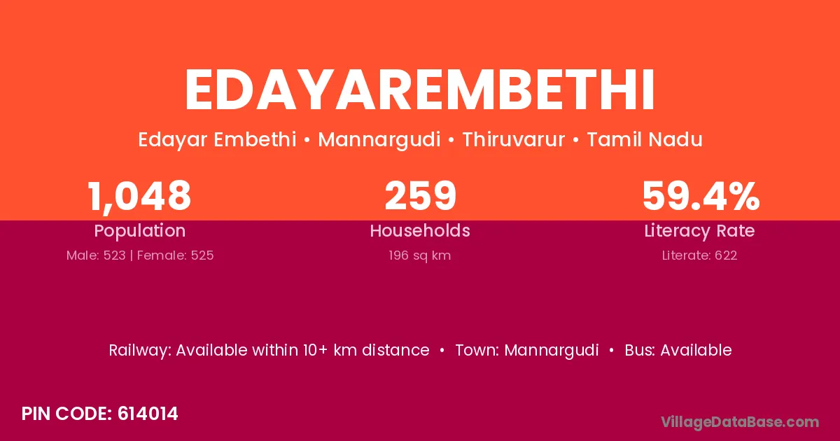 Edayarembethi village has a total population of 1,048 people, of which 523 are males and 525 are females.