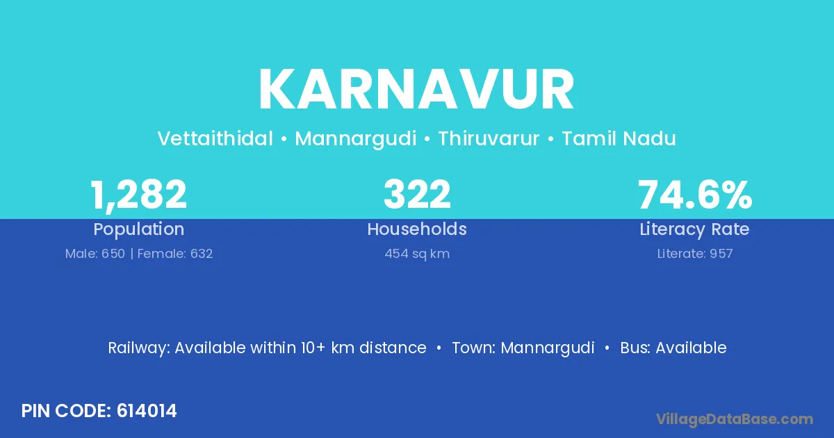 Karnavur village has a total population of 1,282 people, of which 650 are males and 632 are females.