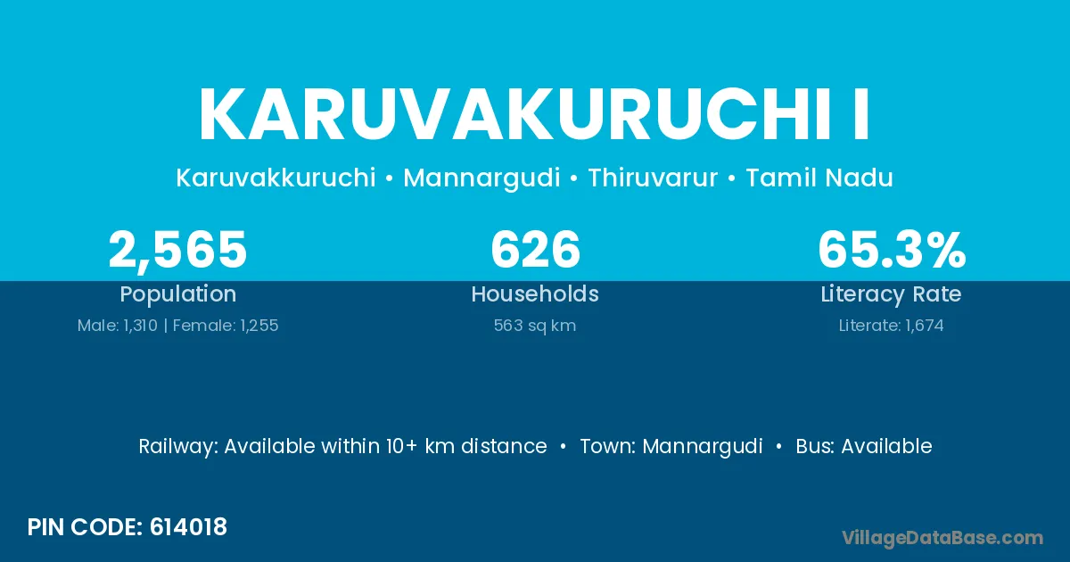 Karuvakuruchi I village has a total population of 2,565 people, of which 1,310 are males and 1,255 are females.