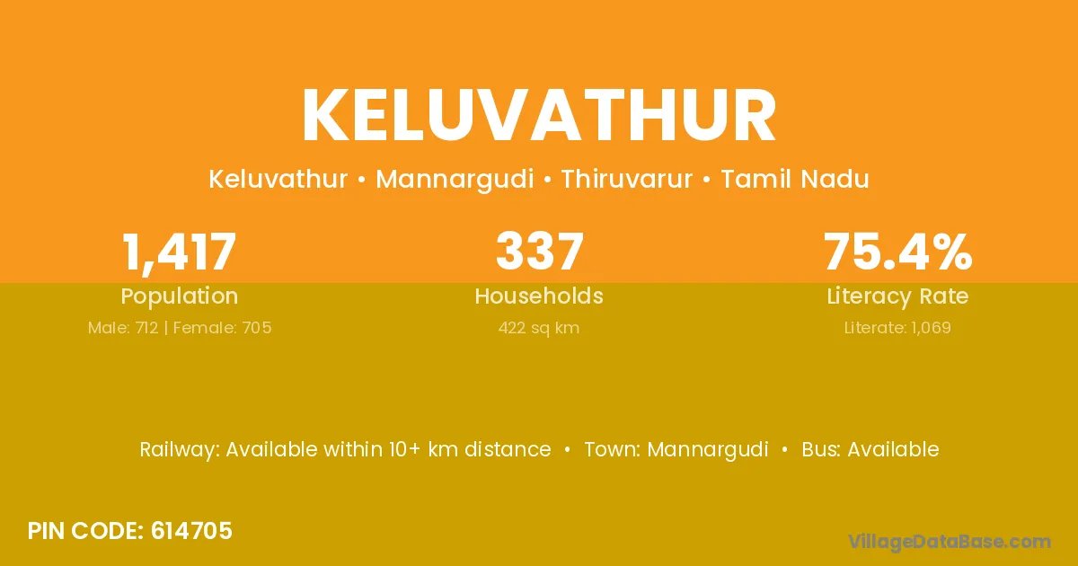Keluvathur village has a total population of 1,417 people, of which 712 are males and 705 are females.