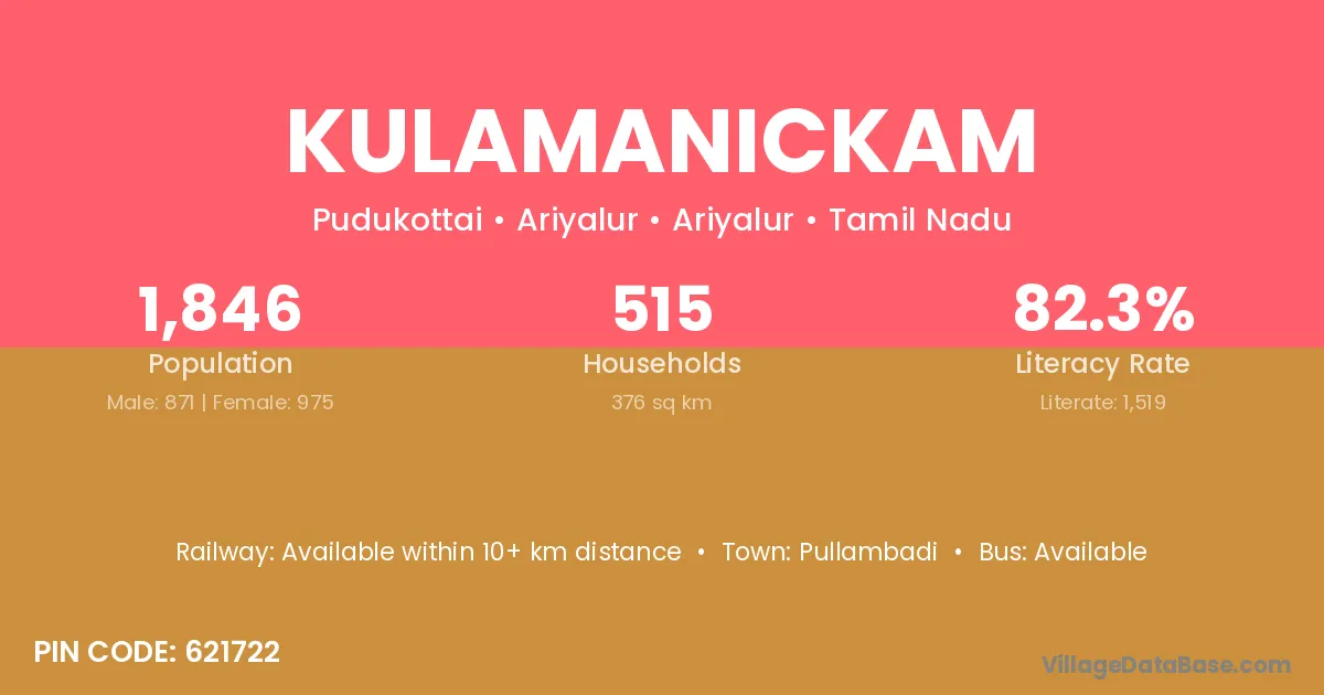 Kulamanickam village has a total population of 1,208 people, of which 616 are males and 592 are females.