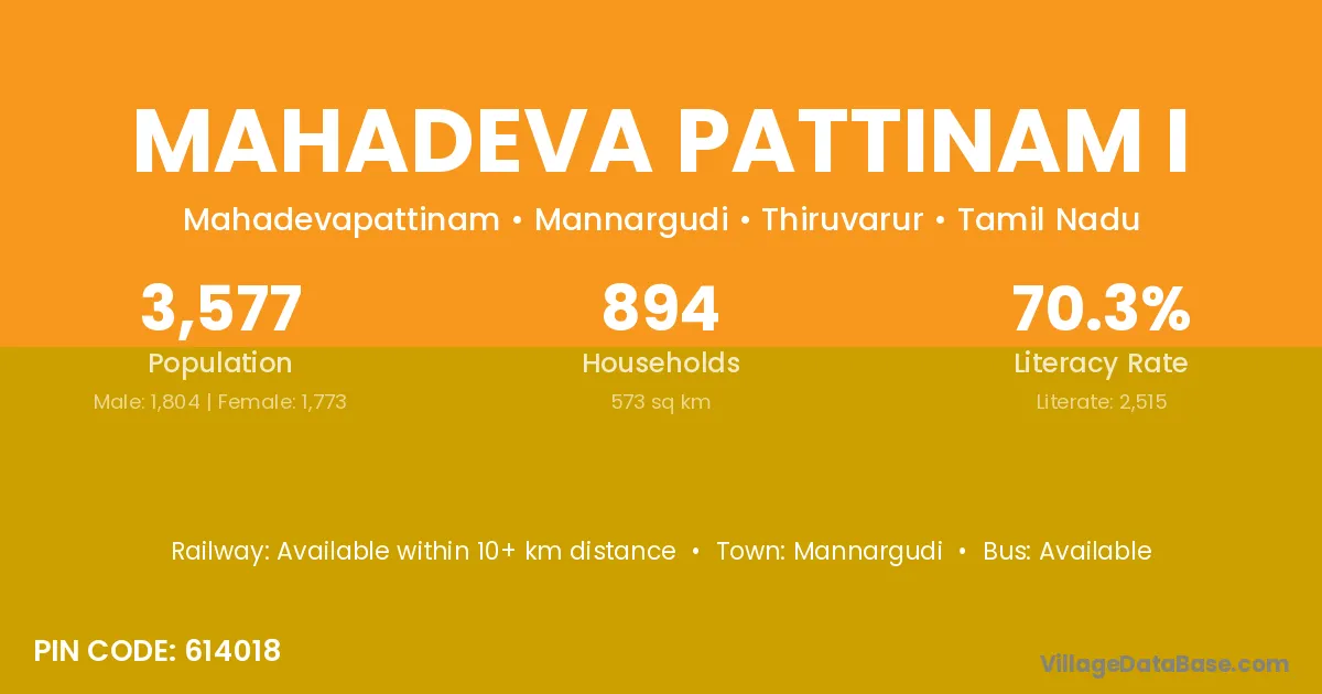 Mahadeva Pattinam I village has a total population of 3,577 people, of which 1,804 are males and 1,773 are females.