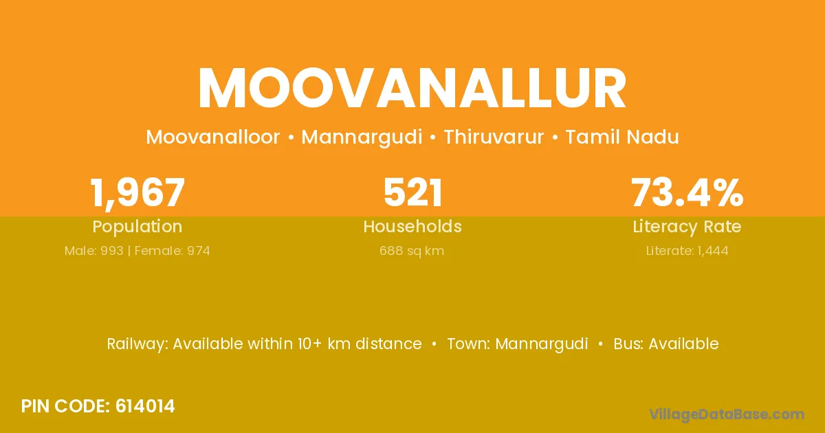 Moovanallur village has a total population of 1,967 people, of which 993 are males and 974 are females.