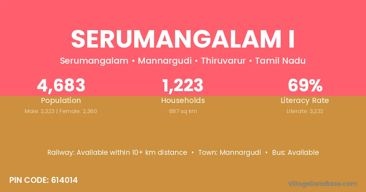 Serumangalam I village has a total population of 4,683 people, of which 2,323 are males and 2,360 are females.
