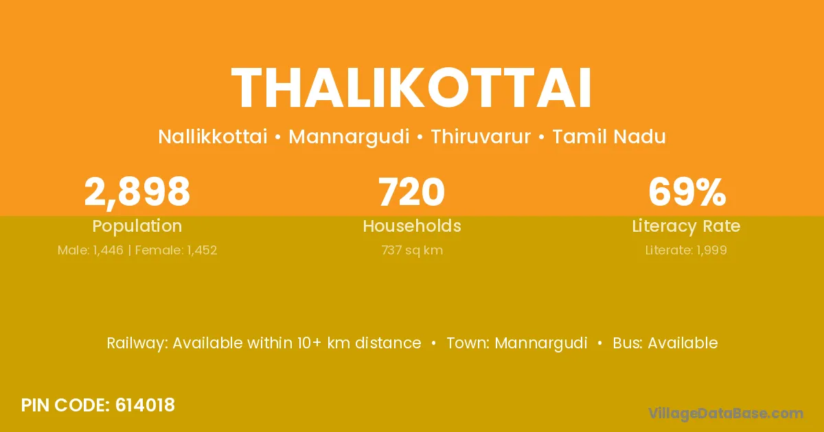 Thalikottai village has a total population of 2,898 people, of which 1,446 are males and 1,452 are females.