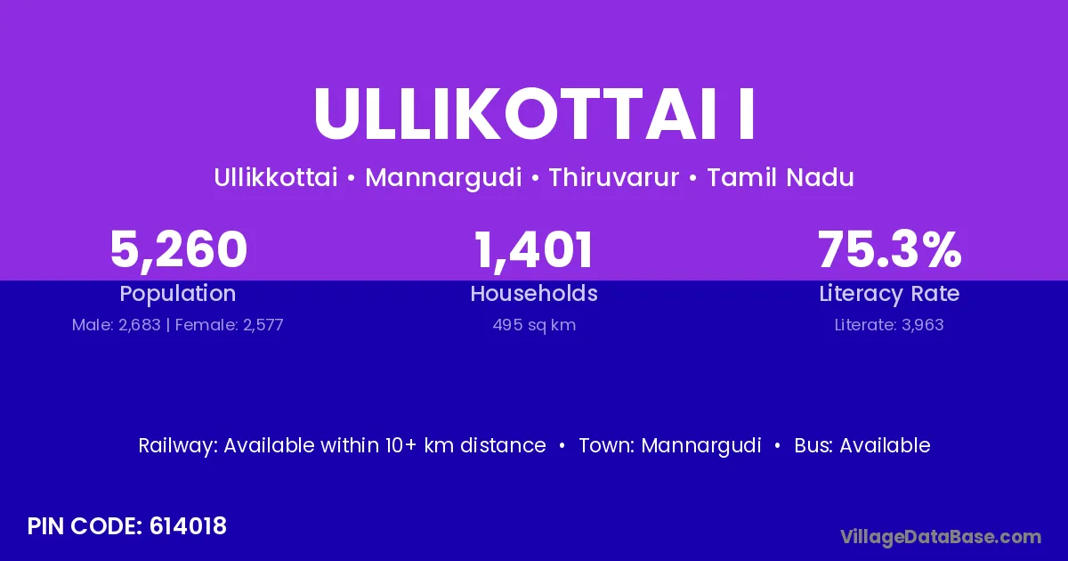 Ullikottai I village has a total population of 5,260 people, of which 2,683 are males and 2,577 are females.