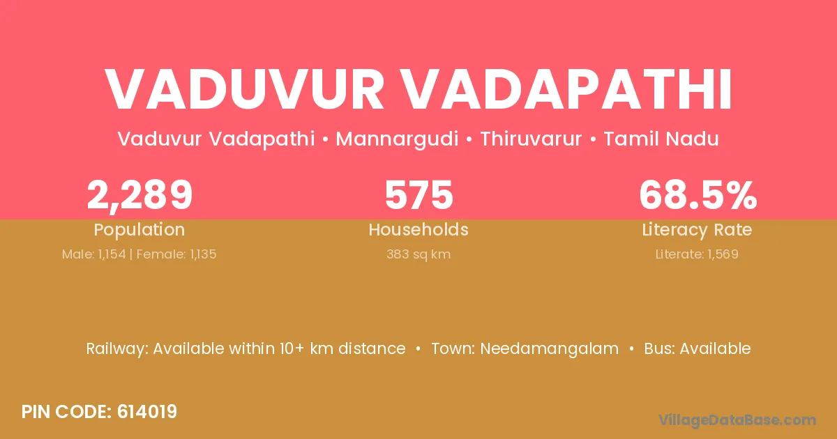 Vaduvur Vadapathi village has a total population of 2,289 people, of which 1,154 are males and 1,135 are females.
